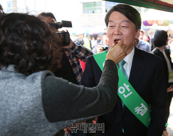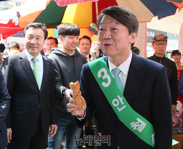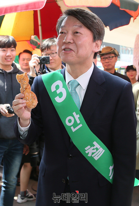안철수 국민의당 대선후보가 22일 오전 경남 창원시 의창구 소답시장을 방문해 상인이 주는 꽈배기를 맛보고 있다. 이어 김해 봉하마을에 위치한 노무현 전 대통령 묘역을 참배했다. (경남 창원=뉴데일리 공준표 기자)(사진=공동취재단)