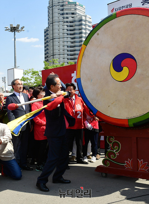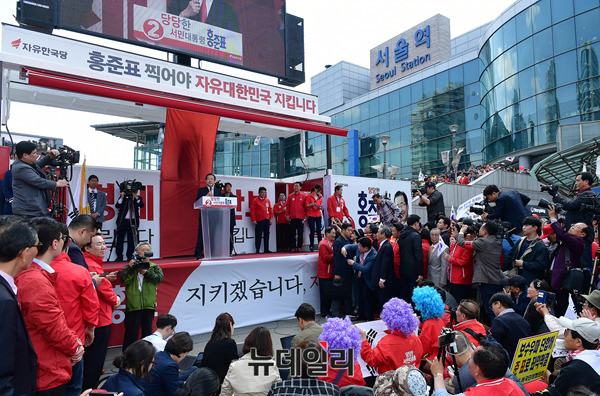 홍준표 자유한국당 대선후보가 22일 서울역 광장에서 열린 자유대한민국 수호를 위한 서울대첩 유세에서 지지를 호소하고 있다.