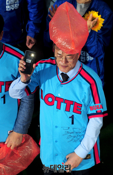 문재인 더불어민주당 대선후보가 22일 오후 부산 서면에서 유세중 야구 응원에 쓰이는 쓰레기봉투를 머리에 쓰고 있다. 문 후보는 앞서 울산 삼산동과 창원시 상남동에서 유세를 이어갔다. (부산=뉴데일리 공준표 기자)