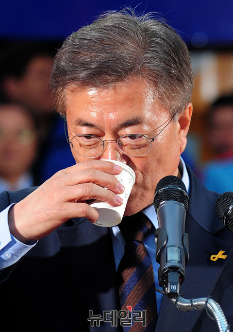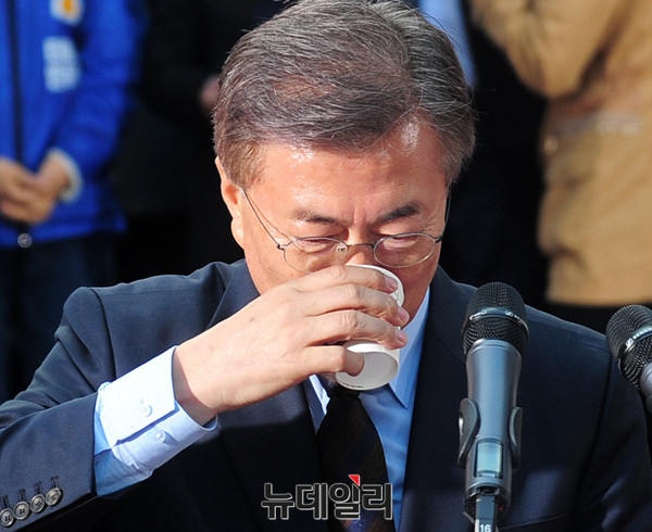 문재인 더불어민주당 대선후보가 22일 오후 부산 서면에서 유세 중 물을 마시고 있다.문 후보는 앞서 울산 삼산동과 창원시 상남동에서 유세를 이어갔다. (부산=뉴데일리 공준표 기자)
