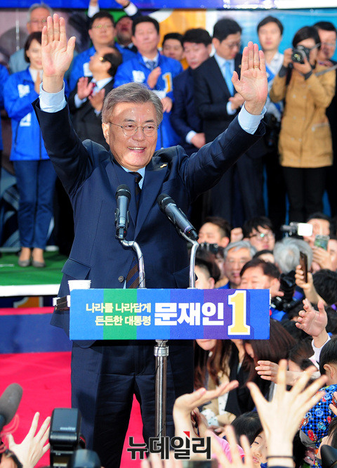 문재인 더불어민주당 대선후보가 22일 오후 부산 서면에서 유세에 앞서 시민들을 향해 만세를 하고 있다. 문 후보는 앞서 울산 삼산동과 창원시 상남동에서 유세를 이어갔다. (부산=뉴데일리 공준표 기자)