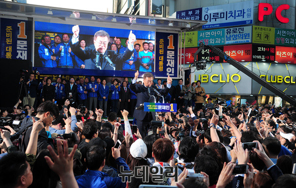 문재인 더불어민주당 대선후보가 22일 오후 부산 서면에서 환호하는 시민들을 향해 엄지로 화답하고 있다. 문 후보는 앞서 울산 삼산동과 창원시 상남동에서 유세를 이어갔다. (부산=뉴데일리 공준표 기자)