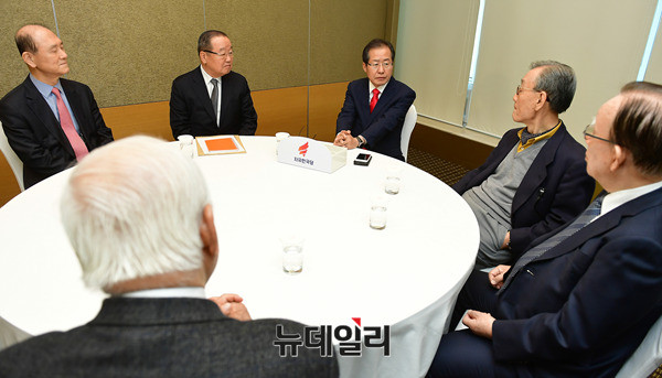 홍준표 자유한국당 대선후보가 23일 오전 서울 여의도 메리어트호텔에서 국가원로를 예방했다. 김재창 전 한미연합사 부사령관, 최광 전 보건복지부 장관, 이영작 박사, 홍준표 후보, 노재봉 전 총리, 정기승 전 대법관, 정진태 전 육군대장.(왼쪽부터)
