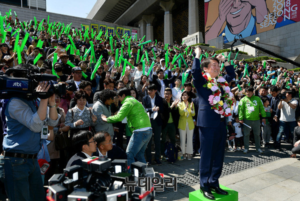 • 안철수 국민의당 대선후보가 23일 오후 서울 광화문 세종문화회관 계단에서 열린 대한민국 미래선언에 참석해 손을 들어 보이고 있다. 문재인, 홍준표, 안철수, 유승민, 심상정 대선후보들은 이날 오후 8시부터 진행되는 후보자 토론회에 참석한다.