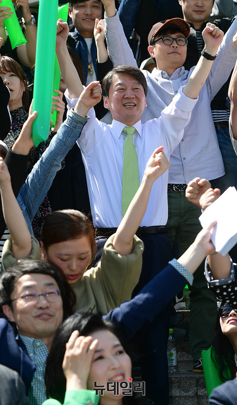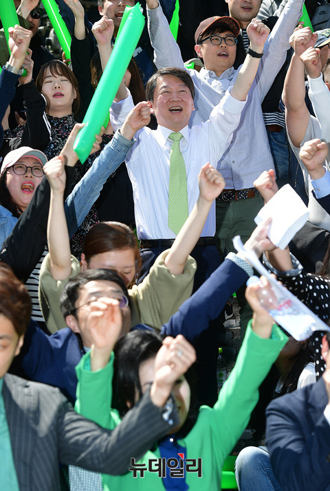 안철수 국민의당 대선후보가 23일 오후 서울 광화문 세종문화회관 계단에서 열린 대한민국 미래선언에 참석해 선거포스터 동작을 선보이고 있다. 문재인, 홍준표, 안철수, 유승민, 심상정 대선후보들은 이날 오후 8시부터 진행되는 후보자 토론회에 참석한다.