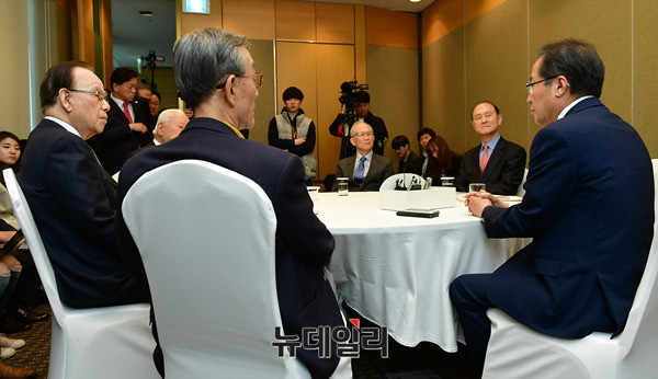 홍준표 자유한국당 대선후보가 23일 오전 서울 여의도 메리어트호텔에서 국가원로와의 모임에 입장하고 있다. 이날 모임에는 김재창 전 한미연합사 부사령관, 최광 전 보건복지부 장관, 이영작 박사, 홍준표 후보, 노재봉 전 총리, 정기승 전 대법관, 정진태 전 육군대장이 참석해 비공개로 진행됐다. 문재인, 홍준표, 안철수, 유승민, 심상정 대선후보들은 이날 오후 8시부터 진행되는 후보자 토론회에 참석한다.