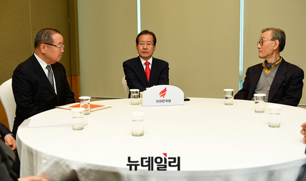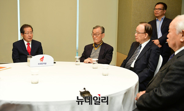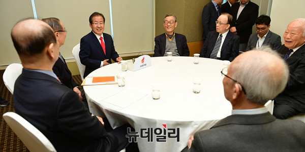 홍준표 자유한국당 대선후보가 23일 오전 서울 여의도 메리어트호텔에서 국가원로를 예방했다. 이날 모임에는 김재창 전 한미연합사 부사령관, 최광 전 보건복지부 장관, 이영작 박사, 홍준표 후보, 노재봉 전 총리, 정기승 전 대법관, 정진태 전 육군대장이 참석해 비공개로 진행됐다. 문재인, 홍준표, 안철수, 유승민, 심상정 대선후보들은 이날 오후 8시부터 진행되는 후보자 토론회에 참석한다.