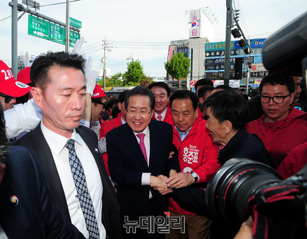 홍준표 자유한국당 대선후보가 24일 오후 경기도 구리시 돌다리사거리에서 유세장에 입장하고 있다.