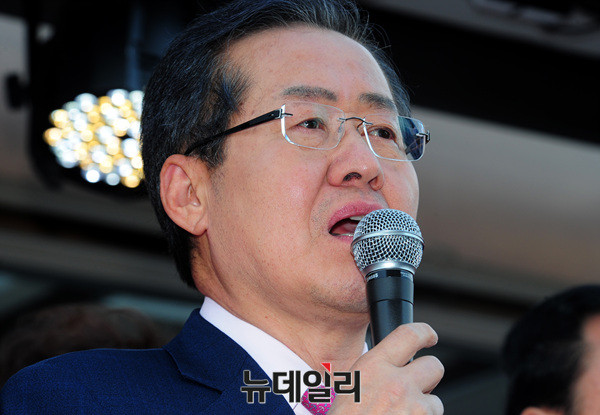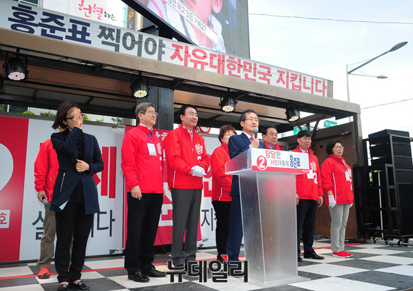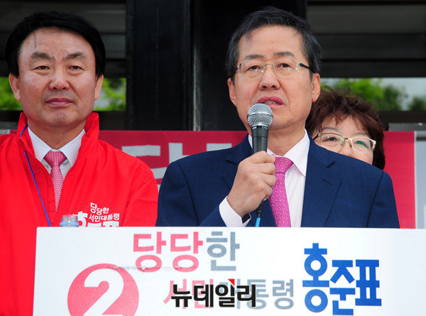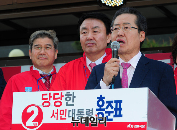 홍준표 자유한국당 대선후보가 24일 오후 경기도 구리시 돌다리사거리에서 발언하고 있다. 홍 후보는 앞서 강원 원주시 의료기기테크노벨리에서 강원지역 공약 발표 후 원주 중앙시장과 춘천에서 유세에 나섰다. 이어 남양주, 하남, 성남 모란시장에서 유세에 나설 예정이다. (경기 구리=뉴데일리 공준표 기자)