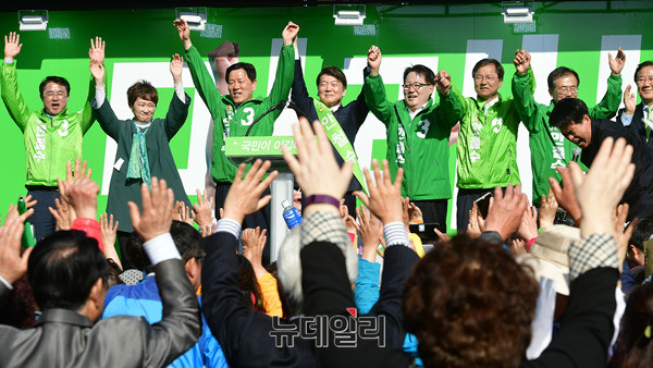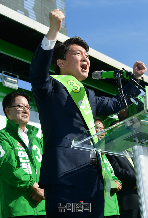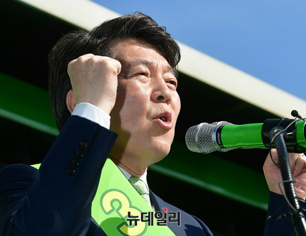 안철수 국민의당 대선후보가 24일 오후 전남 목포시 목포역 광장에서 열린 유세에서 주먹을 쥐고 지지를 호소하고 있다. 안 후보는 이날 지지를 호소하며, 모인 시민들과 '목포의 눈물'을 합창하기도 했다. 안 후보는 전남 함평과 나주, 광주를 각각 찾아 호남권 표심을 모을 예정이다. (전남 목포=뉴데일리 정상윤 기자)