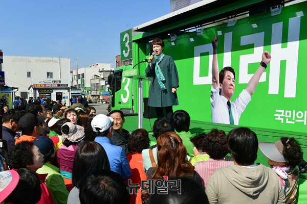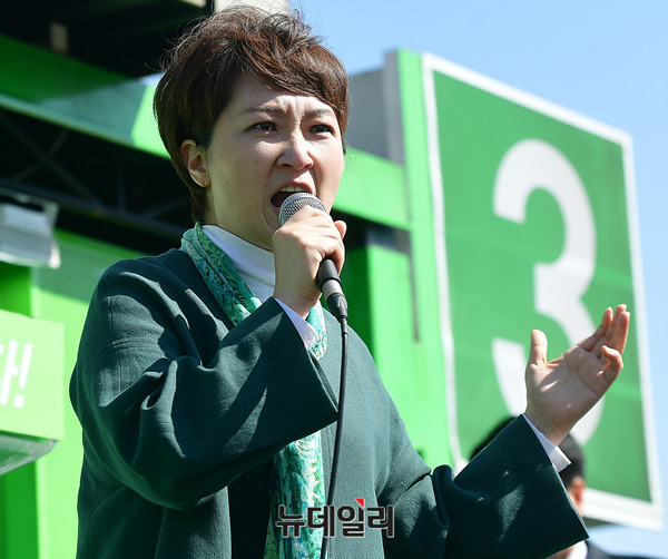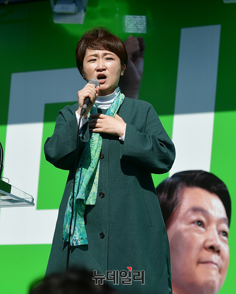 이언주 국민의당 의원이 24일 오후 전남 목포시 목포역 광장에서 열린 유세에서 안철수 후보가 등장하기 앞서 안 후보의 지지를 호소하고 있다. 안 후보는 이날 지지를 호소하며, 모인 시민들과 '목포의 눈물'을 합창하기도 했다. 안 후보는 전남 함평과 나주, 광주를 각각 찾아 호남권 표심을 모을 예정이다. (전남 목포=뉴데일리 정상윤 기자)