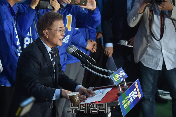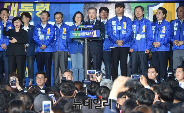 더불어민주당 문재인 대선후보가 24일 오후 충남 천안 신부동에서 열린 집중유세에서 지지를 호소하고 있다.