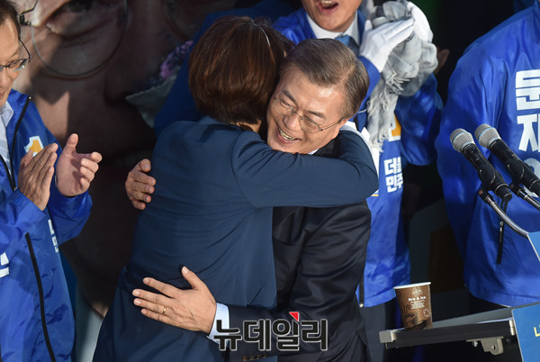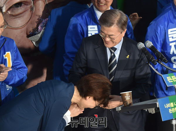 더불어민주당 문재인 대선후보가 24일 오후 충남 천안 신부동에서 열린 집중유세에서 대선경선에서 낙선한 안희정 충남도지사 부인 민주원 씨와 인사를 나누고 있다.