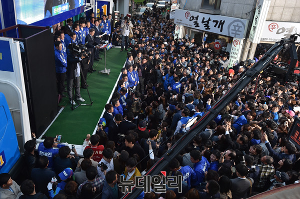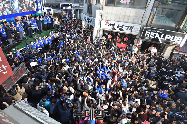 24일 오후 충남 천안 신부동에서 열린 더불어민주당 문재인 대선후보 집중유세장을 지지자들이 가득 메우고 있다.