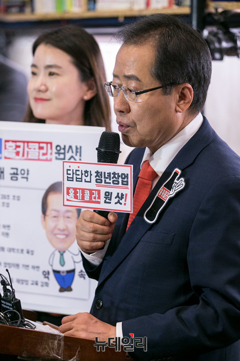 홍준표 자유한국당 대선후보가 25일 오전 서울 마포구 신촌 시티비즈니스센터에서 '답답한 청년창업, 홍카콜라 원샷!'을 주제로 청년창업자들과 간담회에 참석했다. 이번 간담회에는 청년창업자, 청년본부 정책자문단 등이 참석했다.