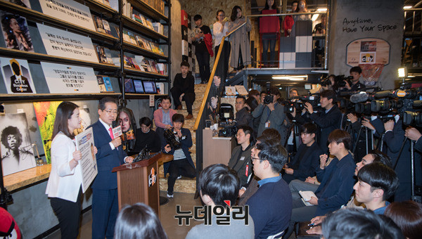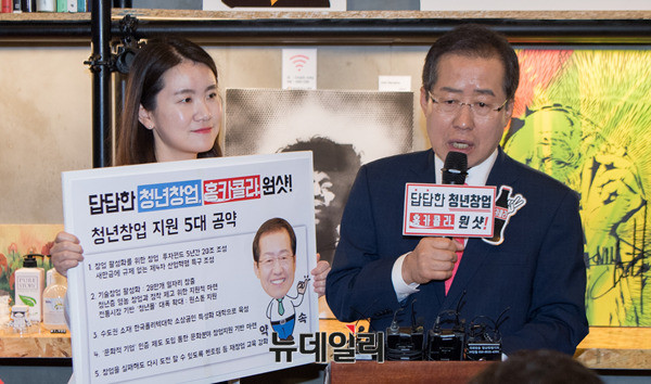 홍 후보는 ▲창업 활성화를 위한 5년간 20조원 창업 투자펀드 조성, 새만금에 규제없는 제4차 산업혁명특구 조성 ▲기술창업 활성화를 통한 28만개 일자리 창출, 청년층 영농창업과 정착 제고를 위한 지원 확대, 전통시장 기반 청년창업 '청년몰' 대폭 확대 ▲한국폴리텍대학을 소상공인 특성화 대학으로 육성 ▲문화분야 창업지원용 '문화적 기업' 인증제도 도입 ▲창업 실패자가 재도전 할 수 있는 멘토링 등 재창업 프로그램 강화 등 '홍카콜라 청년창업지원 5대 공약' 발표했다. (사진=공동취재단)