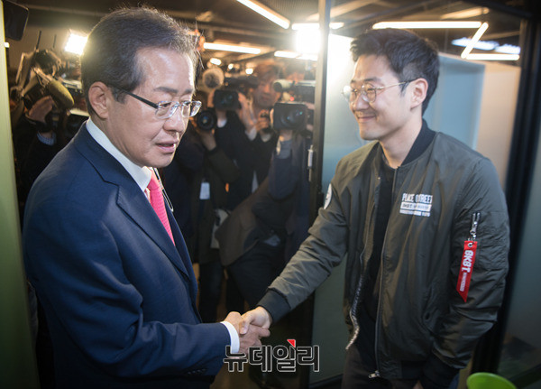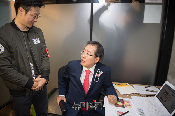 홍준표 자유한국당 대선후보가 25일 오전 서울 마포구 신촌 시티비즈니스센터에서 '답답한 청년창업, 홍카콜라 원샷!'을 주제로 청년창업자들과 간담회에 참석했다. 이번 간담회에는 청년창업자, 청년본부 정책자문단 등이 참석했다.