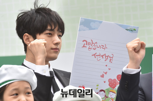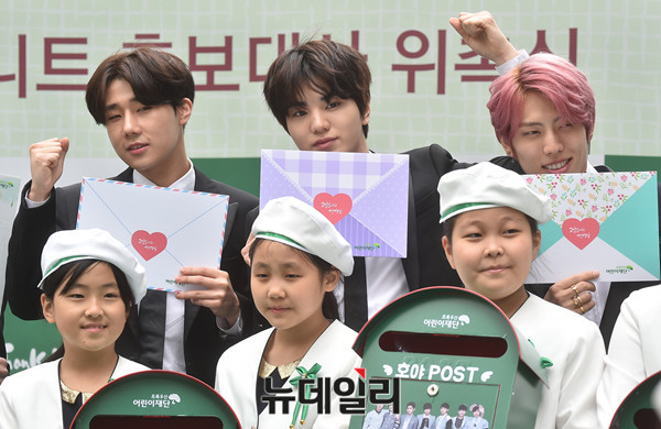 아이돌 그룹 인피니트가(김성규, 장동우, 남우현, 이성열, 엘, 이성종) 25일 오후 서울 중구 초록우산어린이재단 본부에서 진행된 '감사편지쓰기 공모전' 홍보대사로 위촉식에 참석해 기념사진을 촬영하고 있다.
