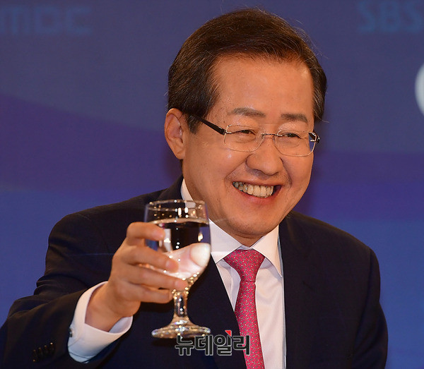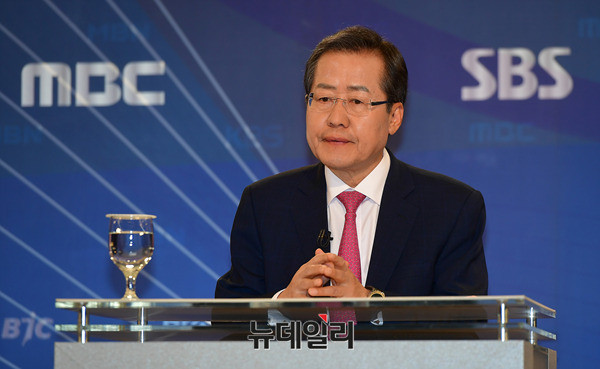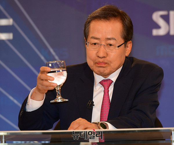 홍준표 자유한국당 대선후보가 26일 오전 서울 세종문회회관에서 열린 방송기자클럽초청 토론회에 참석해 방송 시작 전 물을 마시고 있다. 홍 후보는 이날 오후 대구 서문시장을 방문해 표심을 모을 예정이다.