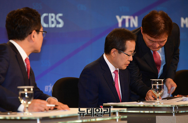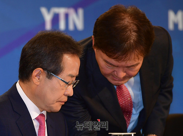 홍준표 자유한국당 대선후보와 민경욱 원내부대표가 26일 오전 서울 세종문화회관 세종홀에서 열린 방송기자클럽 초청 토론회에 앞서 '위키리크스'의 명칭에 대해 의견을 나누고 있다. 홍 후보는 이날 오후 대구 서문시장을 찾을 예정이다.