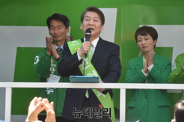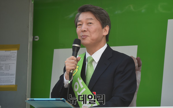 국민의당 안철수 대선후보가 26일 오후 강원 춘천시 명동거리 입구에서 유권자들에게 지지를 호소하고 있다. (춘천=뉴데일리 이종현기자)