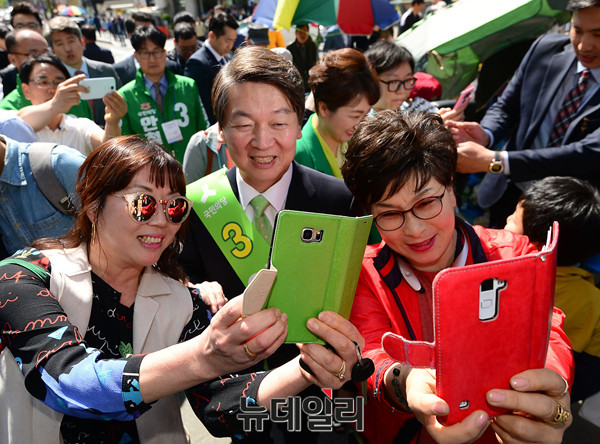 국민의당 안철수 대선후보가 26일 오후 강원 원주시 중앙시장에서 열린 거리유세에서 시민들과 기념사진을 촬영하고 있다. (강원도 원주=뉴데일리 이종현)