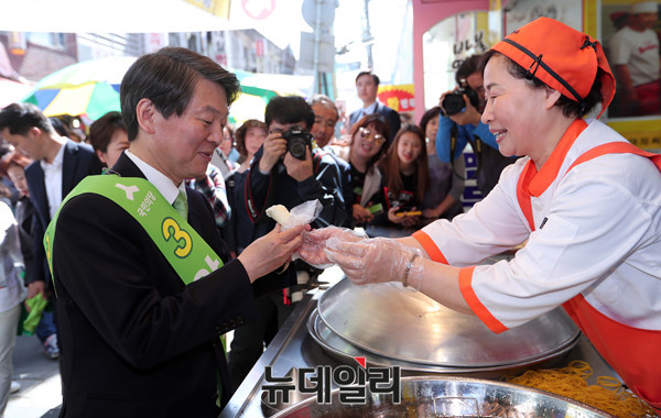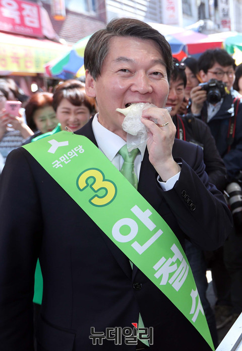 국민의당 안철수 대선후보가 26일 오후 강원 원주시 중앙시장에서 열린 거리유세에서 상인이 건넨 찐빵을 시식하고 있다. (강원도 원주=뉴데일리 이종현)
