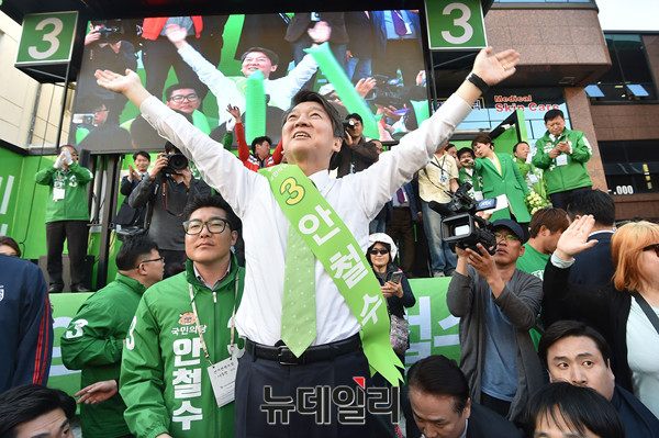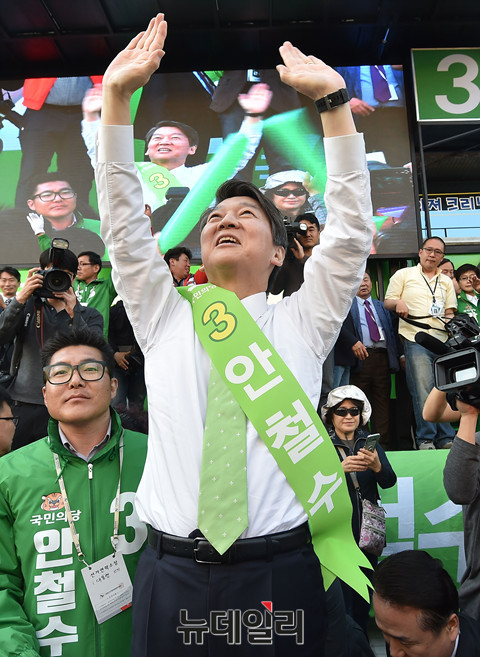 안철수 국민의당 대선후보가 26일 오후 강원도 강릉시 중앙시장에서 열린'강릉 국민승리유세'에서 두 손을 들어 지지를 호소하고 있다. (강원도 강릉=뉴데일리 이종현 기자)