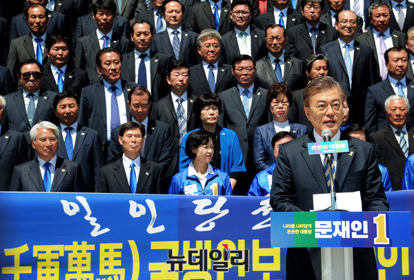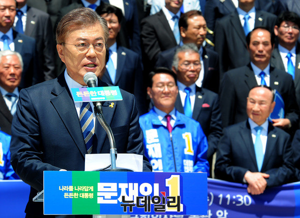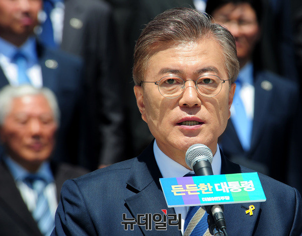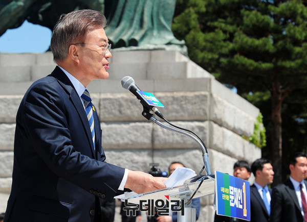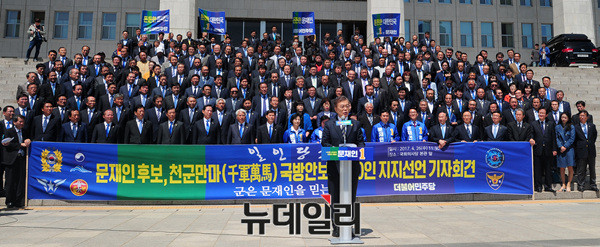 문재인 더불어민주당 대선후보가 26일 오전 국회 국회 본청 앞 계단에서 열린 '국방안보 1천인 지지선언 기자회견'에서 발언하고 있다.