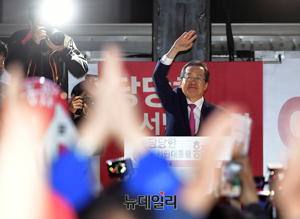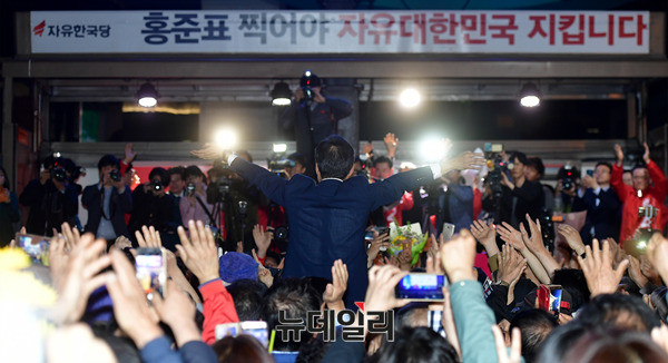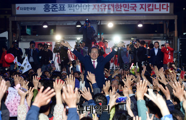 홍준표 자유한국당 대선후보가 26일 오후 대구 서문시장을 찾아 연설에 앞서 시민들의 환호에 손을 들어 화답하고 있다. 홍 후보는 지난 3월 서문시장에서 대선출마를 선언했다. 이후 5번째 대구 방문이다. (대구=뉴데일리 정상윤 기자)
