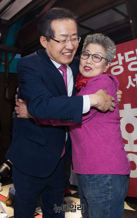 홍준표 자유한국당 대선후보가 26일 오후 대구 서문시장을 찾아 연설에 앞서 서문시장 상인에게 스카프를 걸어주고 포옹하고 있다. 홍 후보는 지난 3월 서문시장에서 대선출마를 선언했다. 이후 5번째 대구 방문이다. (대구=뉴데일리 정상윤 기자, 사진=공동취재단)