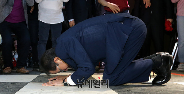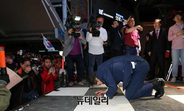 홍준표 자유한국당 대선후보가 26일 오후 대구 서문시장을 찾아 지지를 호소하고, 서문시장을 떠나기 직전 지지자들에게 큰절을 올리고 있다. 홍 후보는 지난 3월 서문시장에서 대선출마를 선언했다. 이후 5번째 대구 방문이다. (대구=뉴데일리 정상윤 기자, 사진=공동취재단)