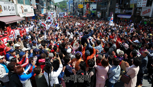 홍준표 자유한국당 대선후보가 27일 오전 경북 구미시 구미중앙로를 찾아 지지를 호소하고 있다. 홍 후보는 경북 김천과 충남지역을 찾아 표심을 모을 예정이다. (경북 구미=뉴데일리 정상윤 기자)