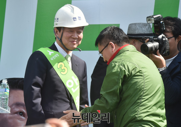 국민의당 안철수 대선후보가 26일 오후 경북 경주시 경주역 광장 유세에서 지진, 원전 등으로 불안해 하는 시민들의 염원을 담은 안전모를 선물 받고 있다.
