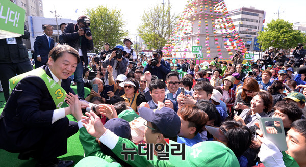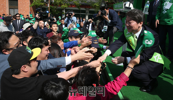 국민의당 안철수 대선후보가 26일 오후 경북 경주시 경주역 광장 유세에서 시민들과 악수를 나누며 지지를 호소하고 있다.