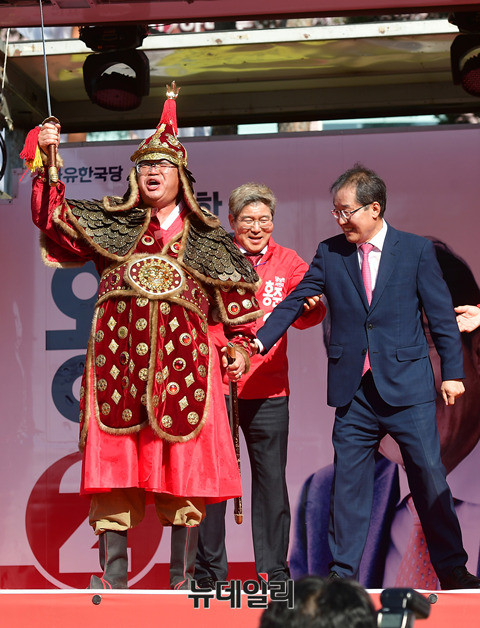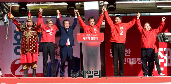 • 홍준표 자유한국당 대선후보가 27일 오후 충남 아산시 온양온천역 광장을 찾아 지지를 호소하고 있다. 홍 후보는 "대통령이 되면 신용불량자로 몰린 사람들과 서민생계형 범죄는 일제히 사면하겠다"고 밝혔다. 이날 오전 경북 구미와 김천을 찾은 홍 후보는 충남 천안, 아산, 서산, 당진을 돌며 충청권 표심을 모았다. (충남 아산=뉴데일리 정상윤 기자)