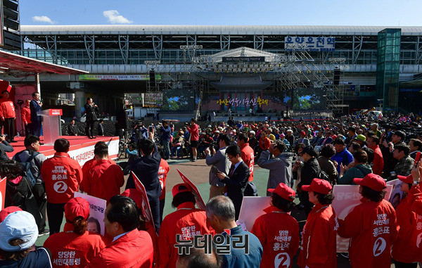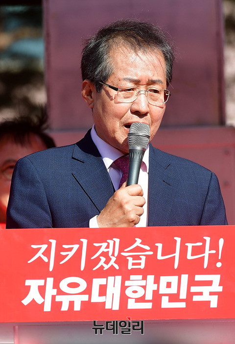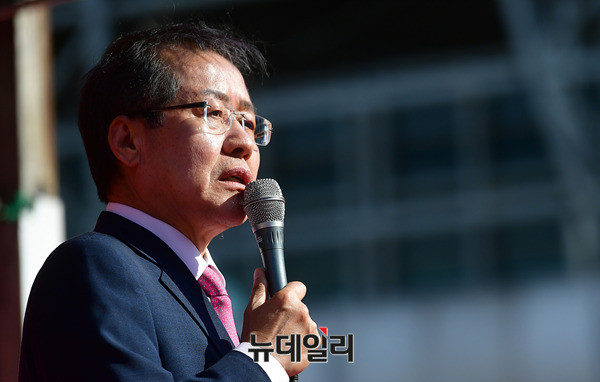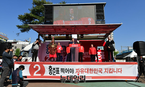 홍준표 자유한국당 대선후보가 27일 오후 충남 아산시 온양온천역 광장을 찾아 손을 들고 화답하는 도중 한 지지자가 박수를 치며 지나가고 있다. 홍 후보는 "대통령이 되면 신용불량자로 몰린 사람들과 서민생계형 범죄는 일제히 사면하겠다"고 밝혔다. 이날 오전 경북 구미와 김천을 찾은 홍 후보는 충남 천안, 아산, 서산, 당진을 돌며 충청권 표심을 모았다. (충남 아산=뉴데일리 정상윤 기자)