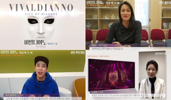 박칼린 음악감독과 블락비 피오가 '비발디아노-거울의 도시'의 필람을 권했다.클래식과 미디어아트의 환상적인 만남으로 전 세계를 사로잡은 '비발디아노-거울의 도시'가 5월 10일부터 13일까지 세종문화회관 대극장에서 아시아 최초로 한국 관객과 만난다.이번에 공개된 영상은 지난 1월 영국에서 열린 공연 실황을 감상한 공연 전문가와 래퍼, 연기자까지 장르를 초월한 아티스들의 관객 추천평을 담았다.음악감독이자 공연 연출가 박칼린은 "드디어 '비발디아노-거울의 도시'가 한국에 옵니다"라며 "다들 알고 계실 비발디의 '사계'가 엄청난 편곡, 화려한 무대 미술과 영상까지 더해 쉽게 보지 못할 클래식 공연이 됐다"고 말했다.블락비의 래퍼 피오는 실황 공연을 보고 난 소감을 마치 랩을 하듯 소개해 눈길을 끈다. 피오는 "사계를 창조한 천재 음악가 비발디의 삶이 흥미진진했다"면서 손에 닿을 듯이 입체적이고 아름다운 영상을 추천했다.이어 배우 소희정은 "클래식 미디어아트 콘서트 '비발디아노-거울의 도시'의 한국 공연을 축하한다"는 인사와 함께 환상적이고 압도적인 무대에 호평을 쏟아냈다.'비발디아노-거울의 도시'는 한국인이 가장 사랑하는 클래식 곡인 비발디의 '사계'를 바탕으로 한 클래식 연주에 3D 미디어아트, 현대무용 등을 결합한 신개념 융복합 공연이다. 21세기 천재 음악가 중 한 명으로 손꼽히는 미칼 드보르작이 작곡과 프로듀서, 키보드 연주를 맡아 진두지휘한다.[사진=에스와이코마드]]
