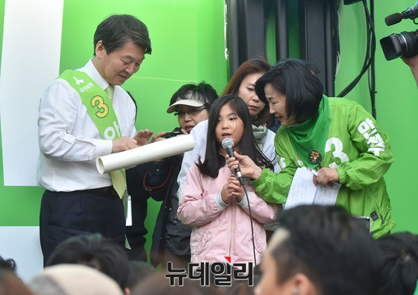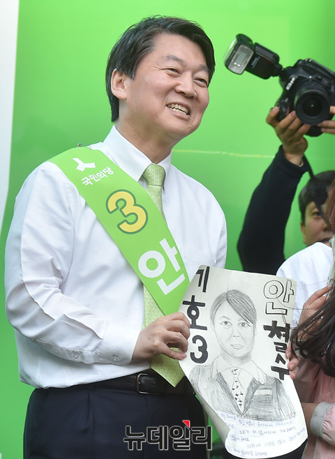 국민의당 안철수 대선후보가 27일 오후 대구 동성로 대구백화점 인근에서 열린 집중유세에서 한 어린이에게 선물받은 포스터를 보며 미소를 짓고 있다.