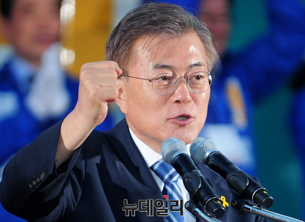문재인 더불어민주당 대선후보가 27일 오후 경기도 성남시 야탑역 앞 광장에서 유세를 하고 있다.