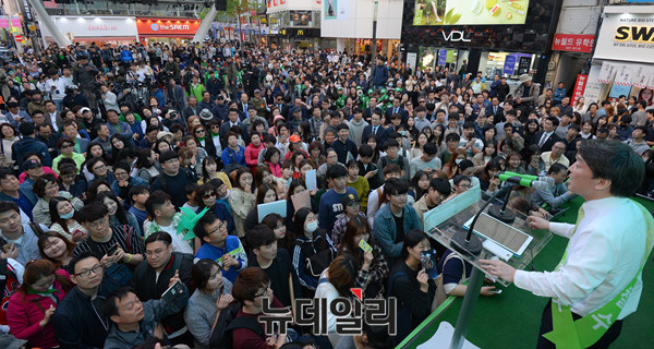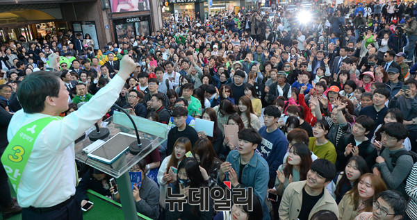 국민의당 안철수 대선후보가 27일 오후 대구 동성로 대구백화점 인근에서 열린 집중유세에서 지지를 호소하고 있다.