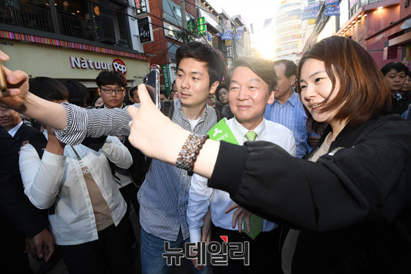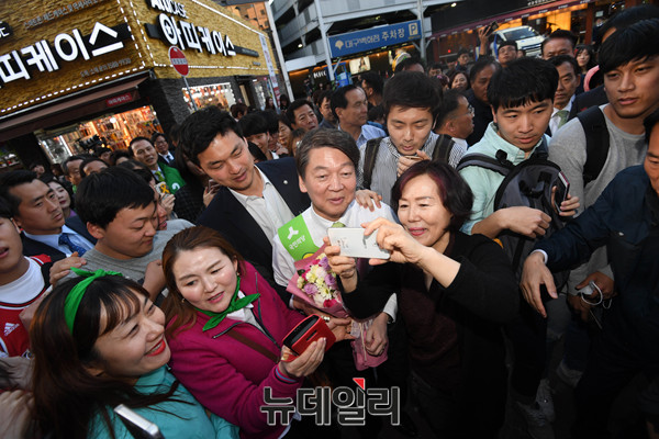 국민의당 안철수 대선후보가 27일 오후 대구 동성로 대구백화점 인근에서 열린 집중유세에서 시민들과 셀카를 찍고 있다.
