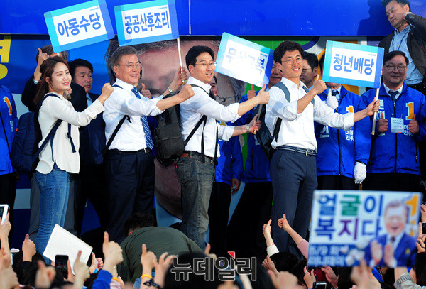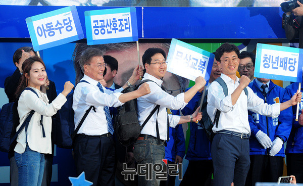 문 후보는 앞서 여의도 중앙당사에서 농업정책, 자치분권정책 발표 및 지방분권 개헌 국민협약식을 가졌다. 이어 야탑역 광장 입구에서tvN SNL코리아의 문재수 캐릭터를 연기한 배우 김민교와 만남을 가졌다. (경기 성남=뉴데일리 공준표 기자)