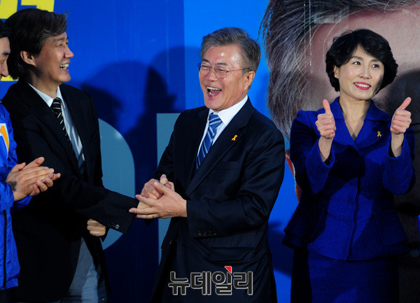 문재인 더불어민주당 대선후보가 27일 오후 경기도 성남시 야탑역 앞 광장에서 유세 후 조국 서울대학교 교수와 손을 잡고 있다.