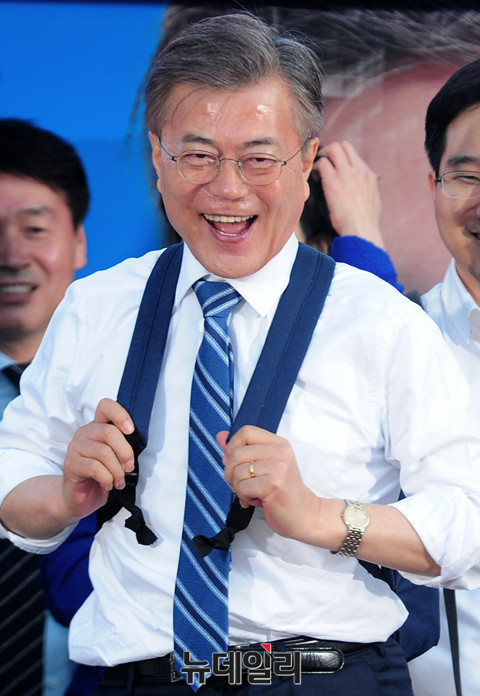 문재인 더불어민주당 대선후보가 27일 오후 경기도 성남시 야탑역 앞 광장에서 성남시 대표정책(청년배당·공공산후조리·아동수당·무상교복)을 전달받은 뒤 가방을 메고 미소 짓고 있다.