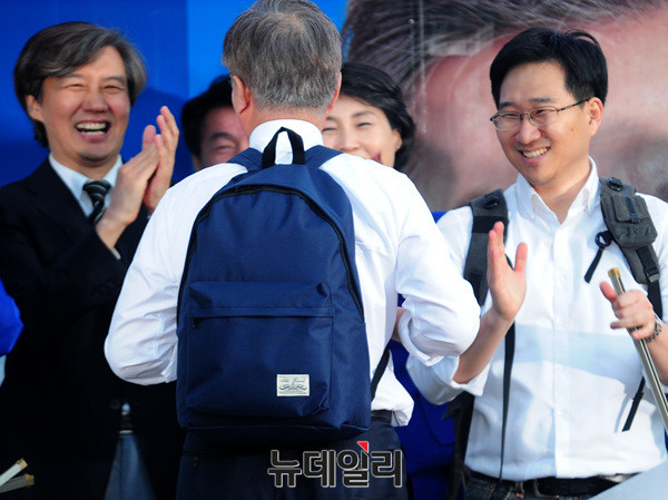 문 후보는 앞서 여의도 중앙당사에서 농업정책, 자치분권정책 발표 및 지방분권 개헌 국민협약식을 가졌다. 이어 야탑역 광장 입구에서 tvN SNL코리아의 문재수 캐릭터를 연기한 배우 김민교와 만남을 가졌다. (경기 성남=뉴데일리 공준표 기자)