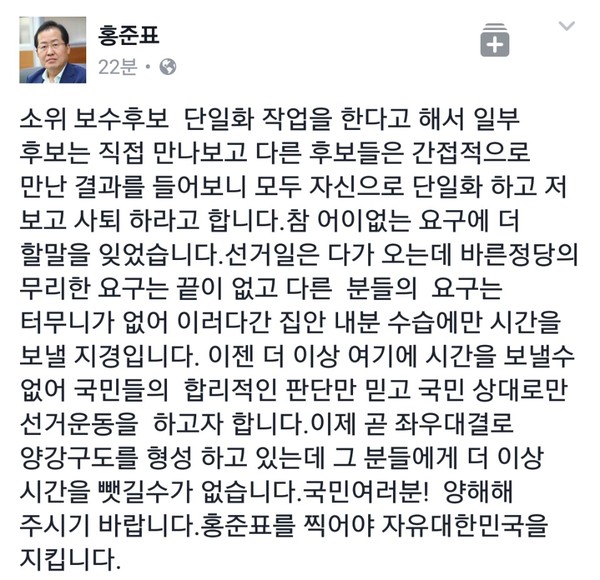 선거 막바지 최대 분수령으로 꼽히는 보수-중도 단일화 가능성이 희미해지고 있다.홍준표 자유한국당 후보는 27일 자신의 페이스북을 통해 "일부 후보는 직접 만나고 다른 후보들은 간접적으로 만난 결과를 들어보니, 모두 자신으로 단일화 하고 저보고 사퇴 하라고 한다"며 "어이없는 요구에 더 할말을 잃었다"고 밝혔다.바른정당 유승민 후보와 새누리당 조원진 후보 등과 단일화 움직임을 보였던 자유한국당이 더이상 후보 연대를 모색하지 않겠다는 입장으로 선회한 것으로 보인다.실제로 자유한국당 김진태 의원은 전날인 26일 조원진 후보와 접촉한 것을 소개했다.'탄핵반대' 태극기 세력과 호흡을 함께 한 김진태 의원은 그동안 자유한국당과 새누리당의 단일화를 꾸준히 추진해 왔다.김 의원은 "조원진 후보가 춘천에 와서 해장국 한그릇 했지만 '홍준표 후보에 대한 신뢰가 없는 상태에서 만나는 것은 의미없다'고 했다"며 "조 후보가 오히려 제게 탈당을 권유했다"고 밝혔다.김 의원은 "해장국은 맛있었는데 만남은 씁쓸하다"며 "얼마전까진 형제처럼 지냈는데 다시 뭉치기가 왜 이렇게 어렵나"며 안타까움을 전했다.조원진 후보는 이날 강원도 춘천 유세에서 "홍준표 후보가 '조원진이 유승민하고 단일화를 하기로 했다'고 얘기했는데, 내가 한 얘기가 아니다"라며 "분명히 배신의 당 유승민과는 정치도 하기 싫고 같은 하늘 아래 살기도 싫은 사람"이라고 말했다.이어 "인명진 전 비대위원장이 당원권 정지 규정을 불법적으로 바꿔 재판 중인 홍준표를 당 대선 후보로 바꾼 것"이라며 "잘못된 경선이기 때문에 김진태 의원은 굴복할 이유가 없다. 탈당하라"고 촉구했다.이 같은 움직임에 대해 홍준표 후보는 "선거일은 다가 오는데 바른정당의 무리한 요구는 끝이 없고, 다른 분들의 요구는 터무니가 없어 집안 내분 수습에만 시간을 보낼 지경"이라고 했다.또 "더이상 여기에 시간을 보낼 수 없어 국민들의 합리적인 판단만 믿고 국민 상대로만 선거운동을 하고자 한다"며 "국민 여러분, 양해달라. 홍준표를 찍어야 자유대한민국을 지킨다"고 지지를 호소했다.