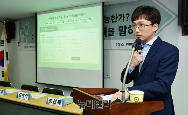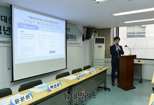 백경훈 청년이여는미래 대표가 28일 오후 서울 중구 한반도선진화재단 회의실에서 열린 대선후보 청년공약 정책토론회에서 '대선후보 청년공약의 평가:청년들은 이것을 원한다'를 주제로 발표를 하고 있다.