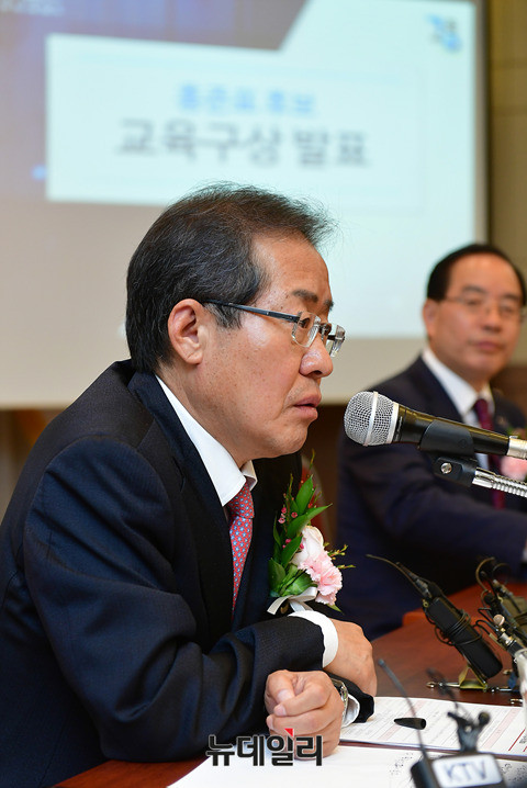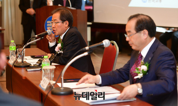 홍준표 자유한국당 대선후보와 하윤수 한국교총 회장이 28일 오전 서울 서초구 한국교총회관에서 열린 교육정책간담회에 참석해 박수를 치고 있다. 홍 후보는 "개천에서 용이 나는 교육을 만들겠다"고 교육구상을 발표했다. 이날 간담회는 한국교원단체총연합회 초청으로 '미래형 인재를 육성하는 교육'을 주제로 진행됐다.