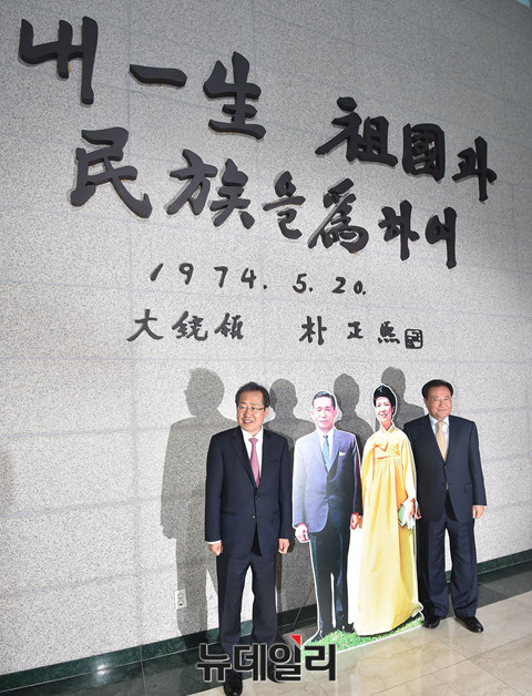홍준표 자유한국당 대선후보와 좌승희 박정희기념재단이사장이 28일 오후 서울 마포구 박정희대통령기념도서관을 방문해 고(故) 박정희 대통령 내외 등신대 앞에서 기념사진을 촬영하고 있다.